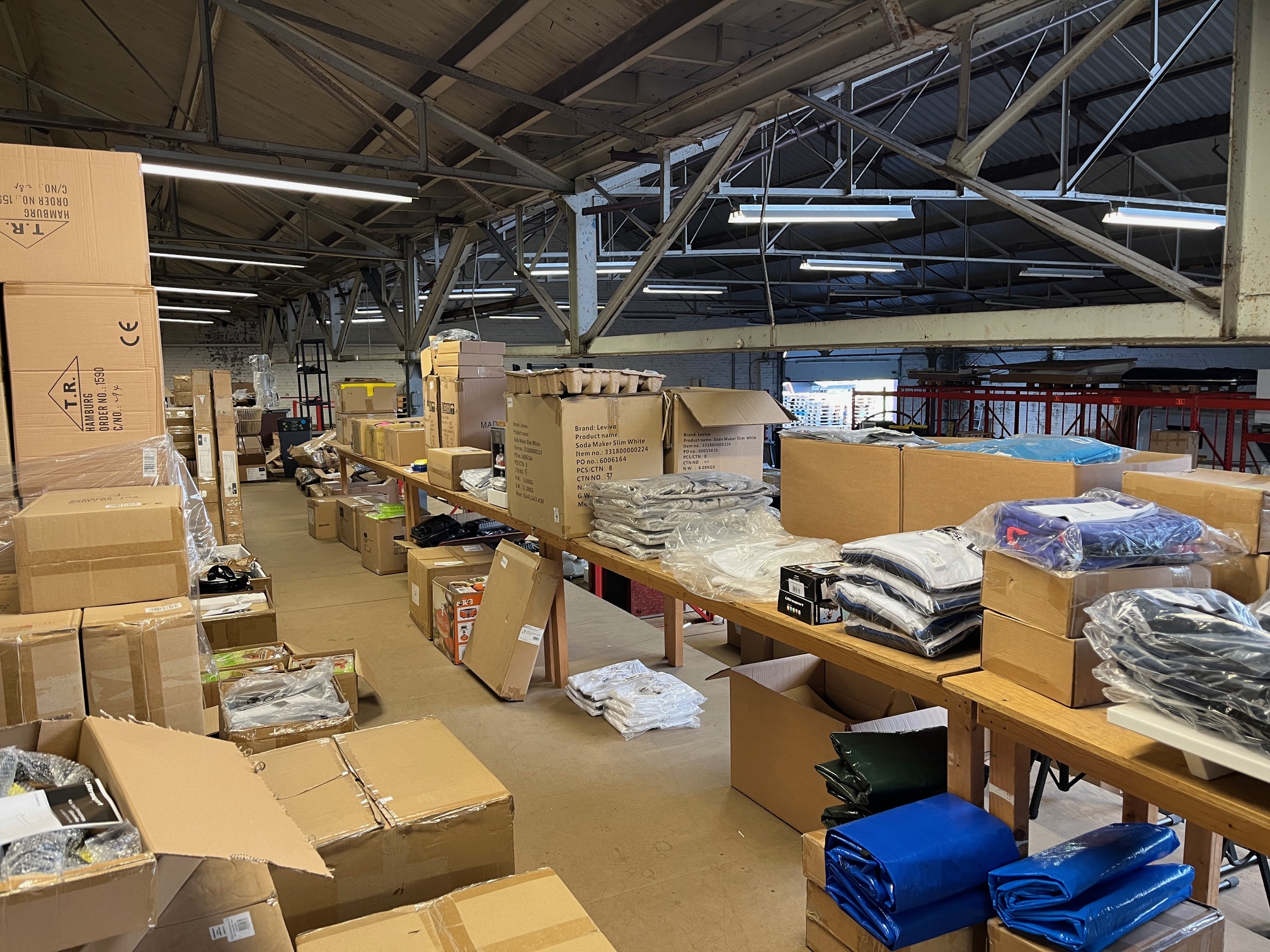 Magazijnopruiming met voorraad van consumentengoederen.